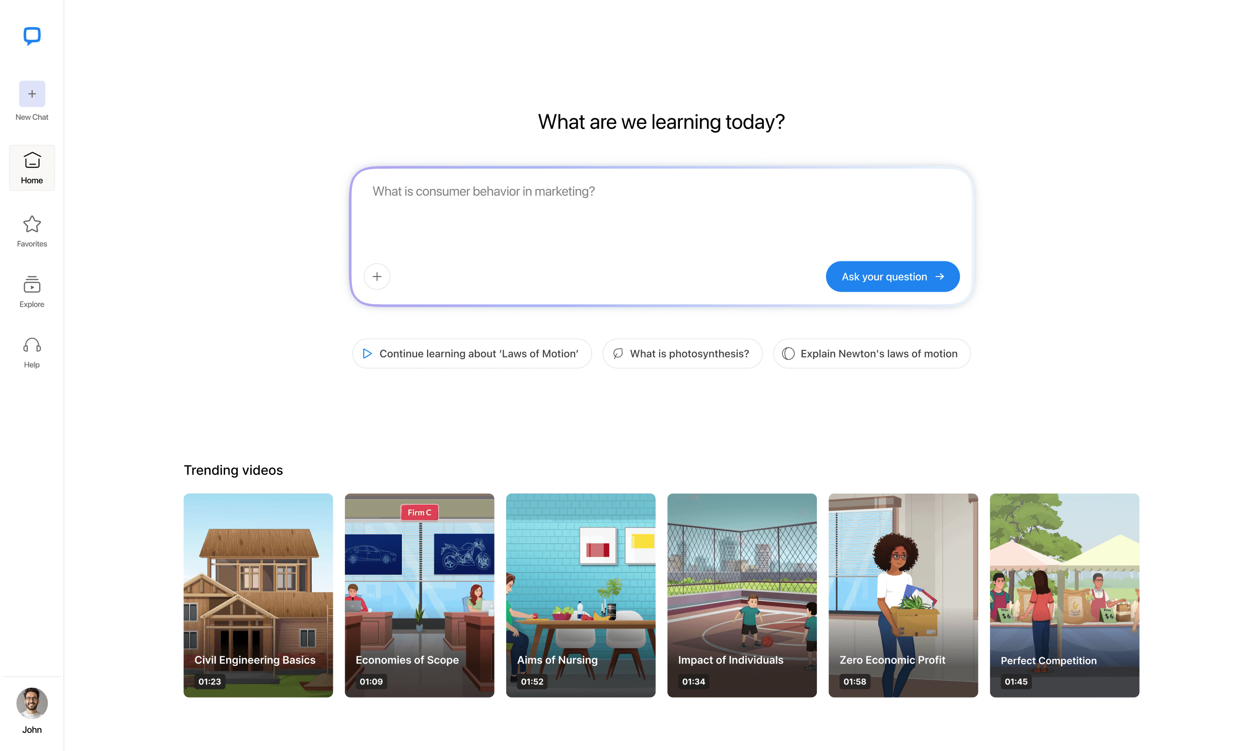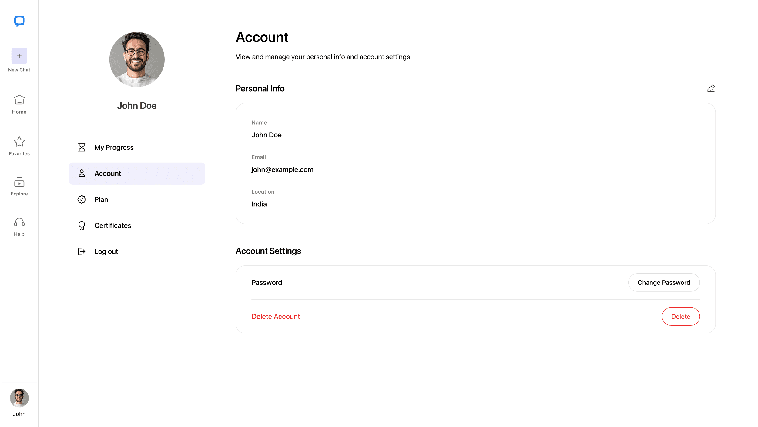 Home — A personalized launchpad for chat, in-progress courses, and earned certificates.