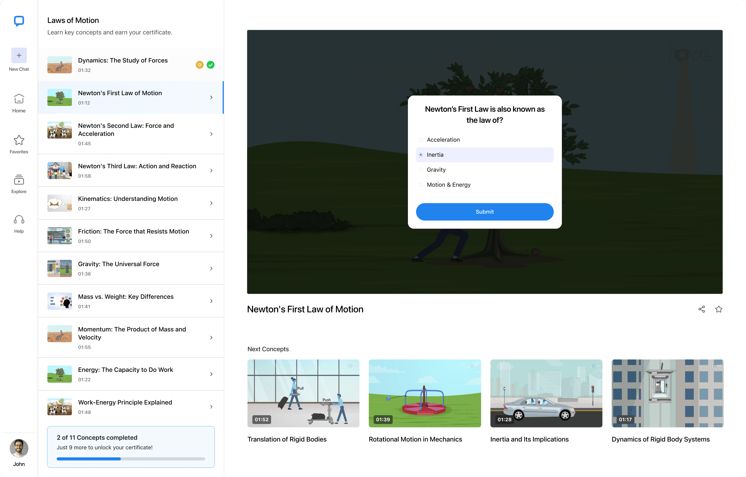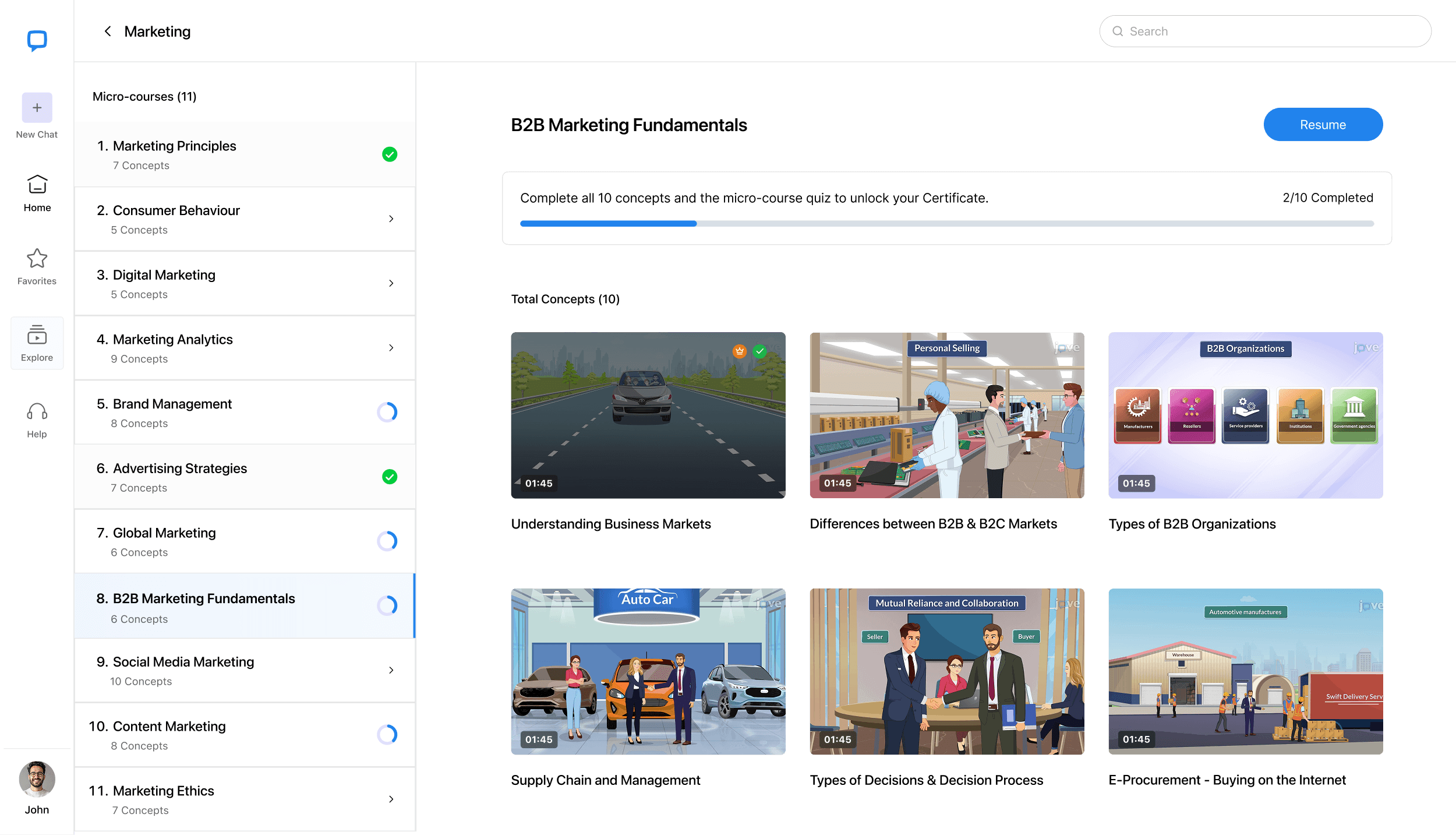A learner could ask a question, get a short video, take a quick quiz, and then be nudged into a micro-course. Progress tracking and a final quiz led naturally to a certificate.