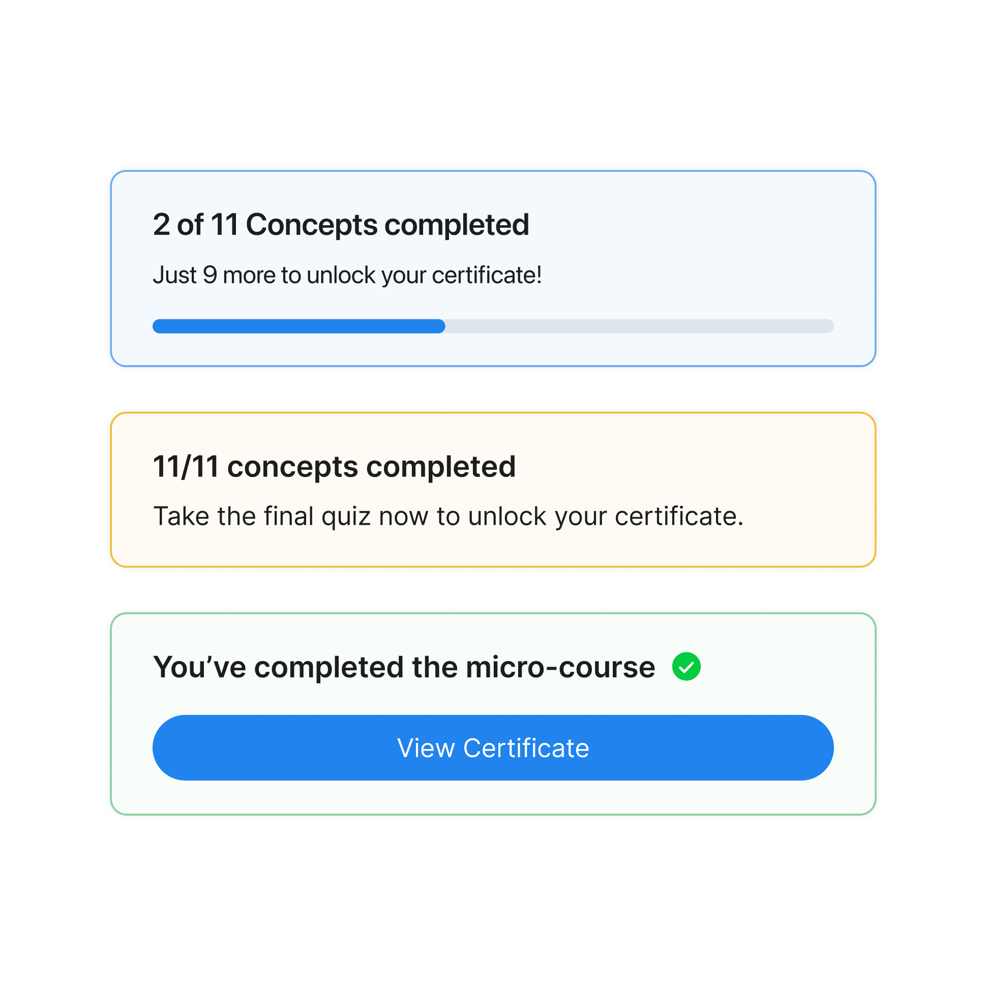 Rings, sticky bars, and microcopy like “3 concepts done, certificate in sight” give learners momentum. Visible progress boosts certificate completions by 22%.